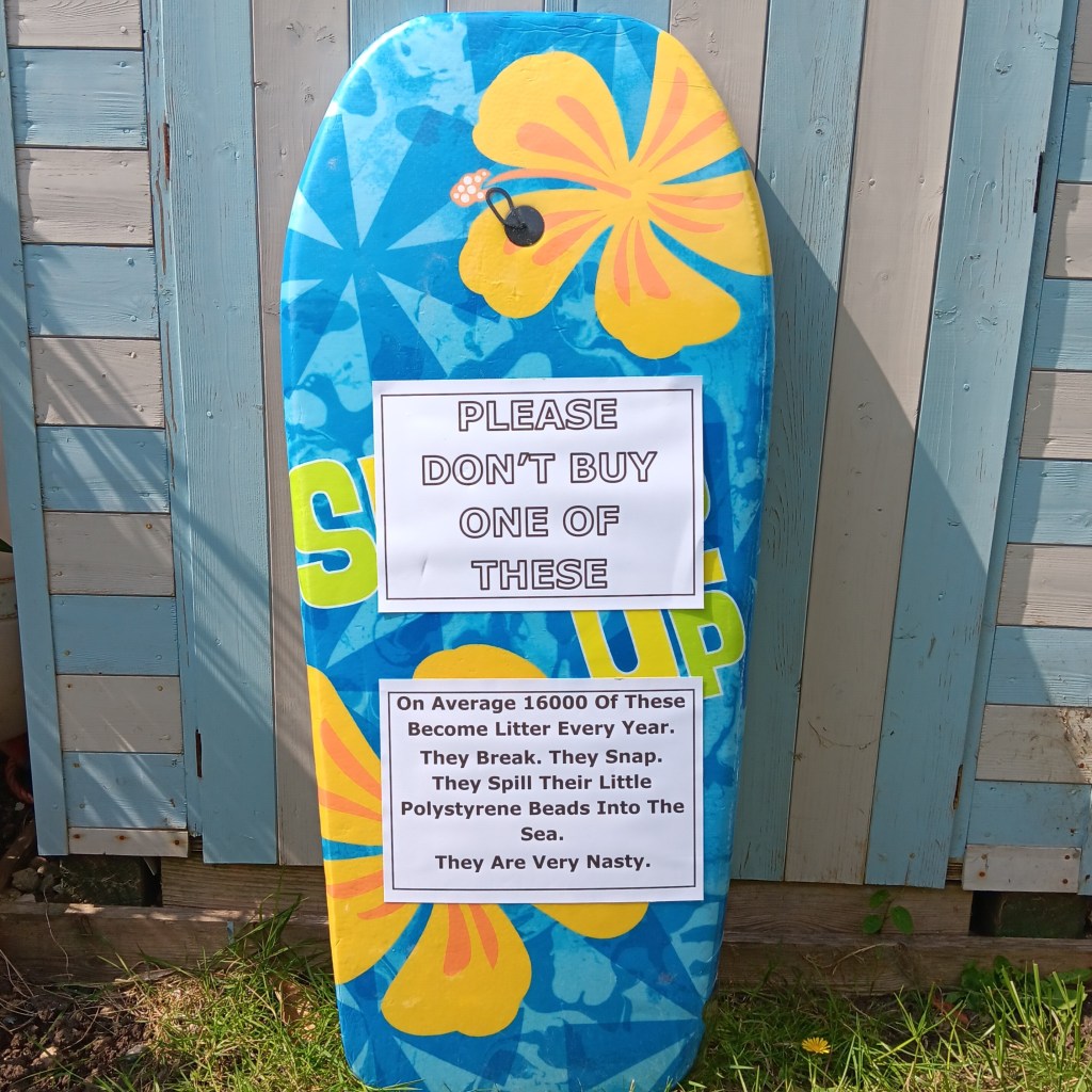 One of the frustrating things about these nasty boards is that they are sold by national chains, including those who claim to be environmental champions. Big businesses love publicity, but aren’t so keen when it’s negative. If you see polystyrene bodyboards for sale in one of their shops, take a photo and share it on their Socials – ask them why they are choosing to sell something that is so damaging to the environment. The shops I can remember seeing them in are B&M, Home Bargains, Poundstretcher, Flying Tiger and obviously Trago Mills. If you’re sharing on Instagram, use the tag #WaveOfWaste.