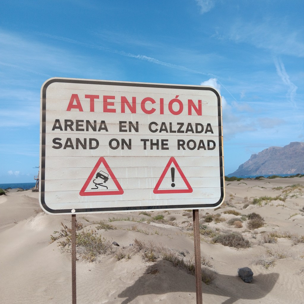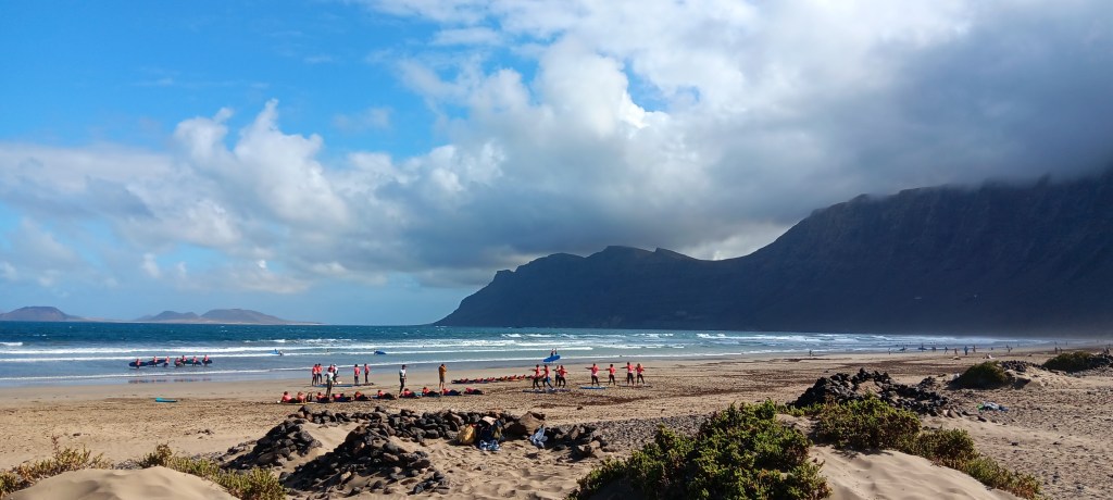 Famara is the best known Surf Beach on the island, and it didn’t disappoint. When you drive to it on the LZ402, the vast emptiness of the area is gobsmacking. The satnav says 5 miles to go and you can see the whole beach and town ahead. Unlike the volcanic rocks and debris that is scattered around other parts of the island, this is practically a desert, with sand dunes. On our first day, there was low cloud covering the mountains, and it turns out that this is a thing. The clouds are there in the morning, then burn off and it’s sunnier later in the day. And it is windy. This means sand is going to get everywhere. There are rock ‘shelters’ which are windbreaks, but you might have to dig out all of the sand to be able to use them.