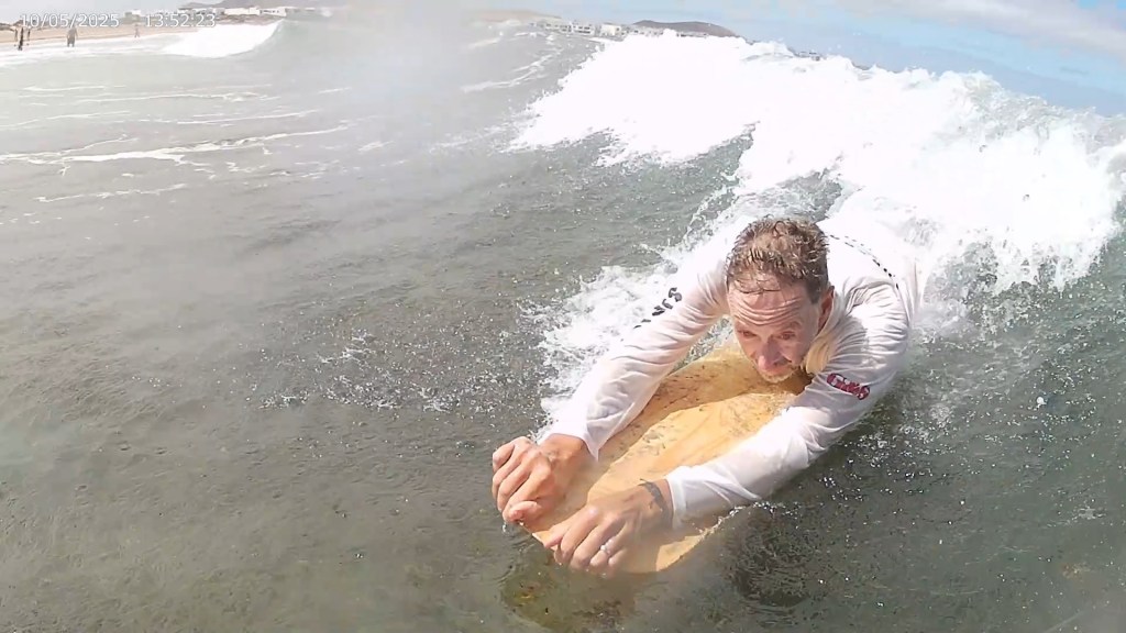 We ended up going to Famara five times on our trip. Although it was never perfect surf conditions (it was either an onshore or sideways wind), it really was an excellent place for boarding. Surfline reckoned it was ‘poor’, but it was 3 or 4 feet with a twelve second period. And being a long shallow sandy beach, there were plenty of long slides to the shore. It was here that I fully tested my Little Skidda. It worked so well, super fast and so much pulling power. It wasn’t the wave carrying me, it was the handplane driving me along. Another great thing was that the water temperature was around 23 degrees. Apparently, late September, early October is the sea’s warmest time. Some things to be wary of, there was a strong pull, not a rip, just a northward pull, which at times made it difficult to stay still. Because it’s so good for surfing, there are loads of Surf Schools, which can be a pain. There are gaps when they change around, but because of the pull, we would start away from them and then they would be on top of us. Finally, the rental surfboards tend to be proper boards, not foamies. There were a few near-misses with one woman, who had no control. Muy Peligroso! Any experienced surfers are much further out.